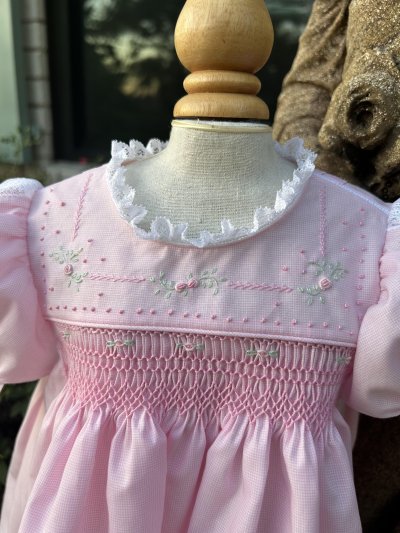 This class is all about machine French sewing, smocking, and hand embroidery. Different techniques will be taught on fine Swiss fabric, attaching lace insertion to lace and fabric. Learn how to attach entredeaux to bodice and shoulders, entredeaux to neck, and hand sew gathered lace to entredeaux. We will make a lace band which will be attached to the sleeves and bottom of skirt. You will also learn the stem stitch, bullion rose, and feather stitch all hand embroidered on the front bodice. Smocking techniques we will cover include the cable stitch and babywave.
